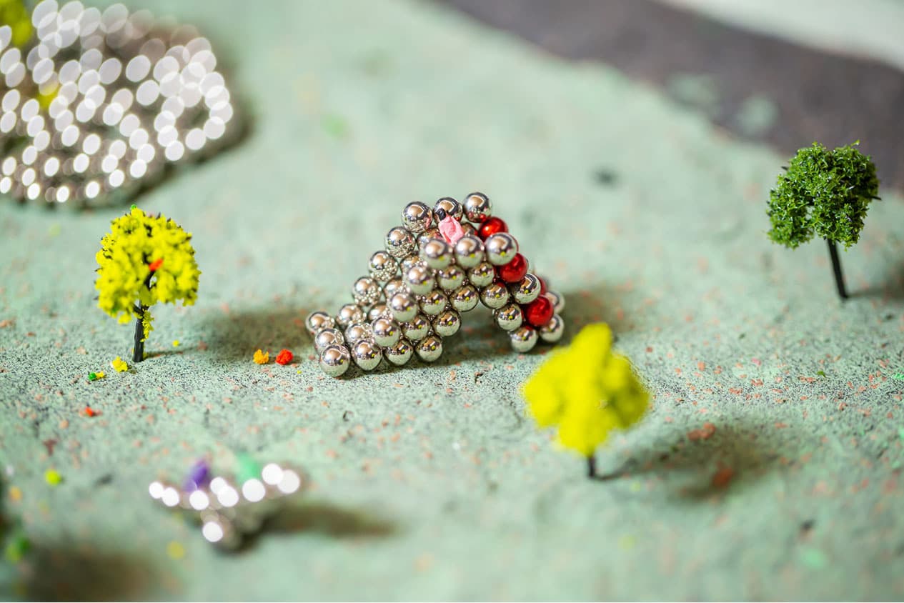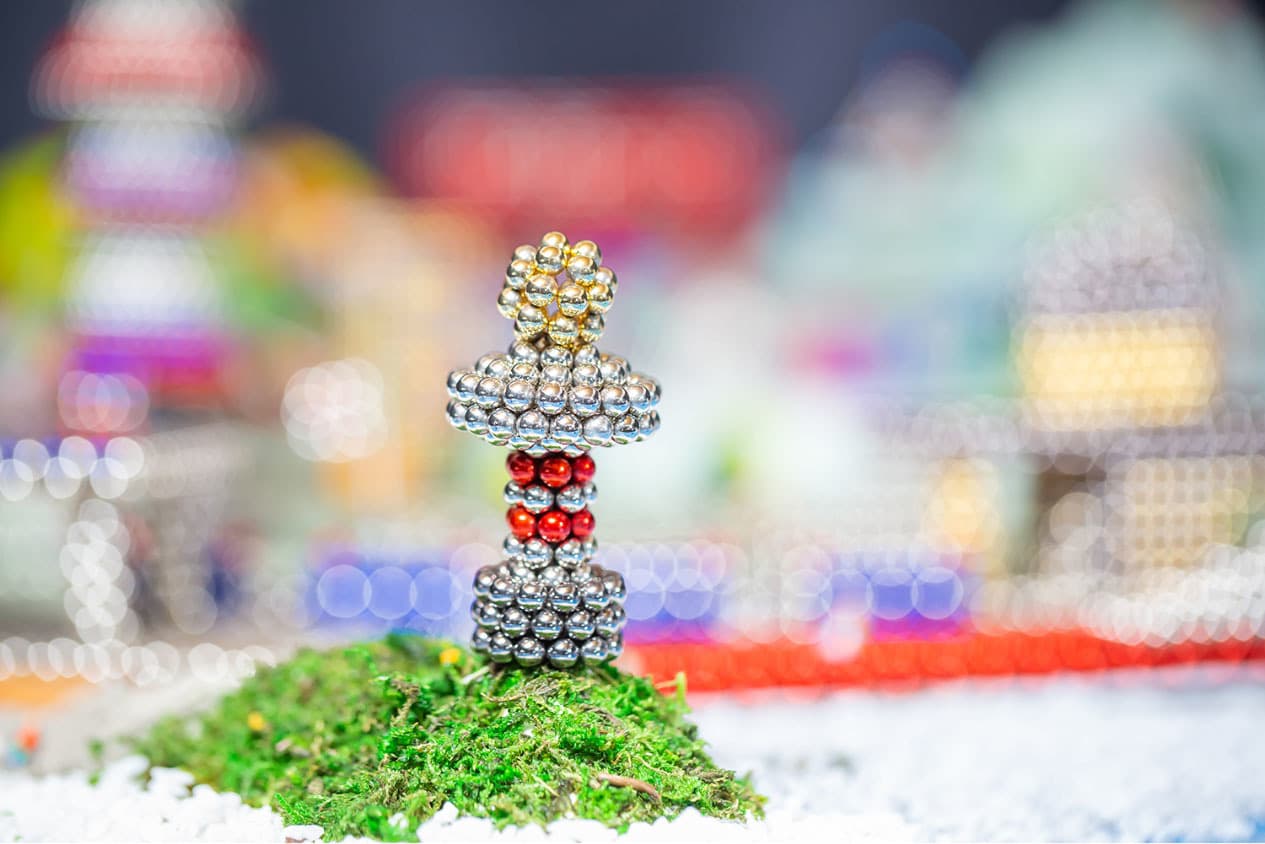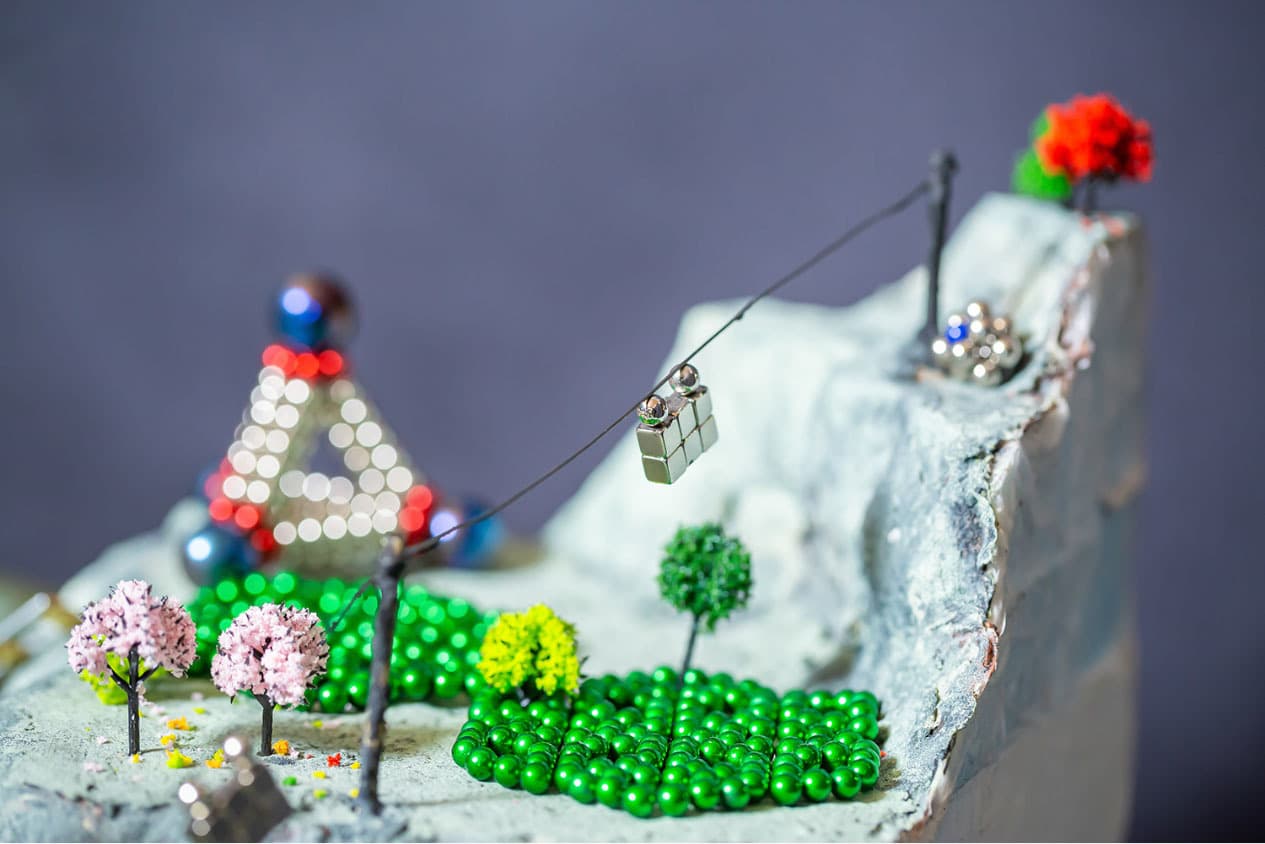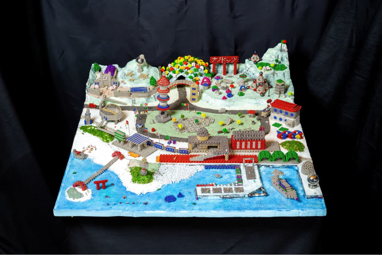 全国から集まったナノドッツの達人12名が、3日間かけて作り上げたジオラマ「ナノワールド」です。約30,000粒の球体磁石を使い、知恵と技術を集結させ作りあげました。
